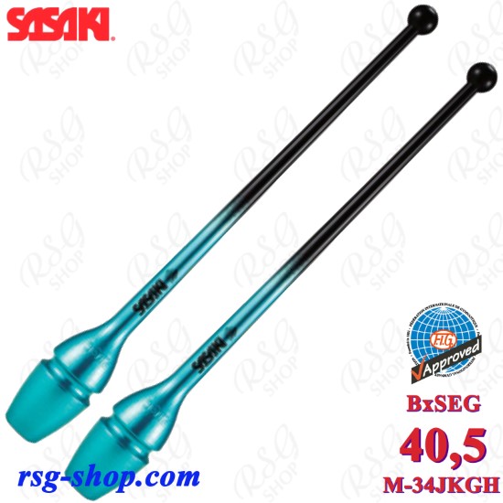 Mehrfarbige einsteckbare gummi Keulen Sasaki M-34JKGH für Rhythmische Sportgymnastik. Es gibt die Möglichkeit der standfesten Fixierung der Kugel in dem Kopf der zweiten Keule.