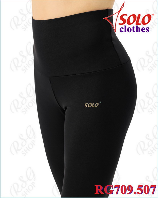 Der hohe doppelte Bund, verstärkt mit einem elastischen Band, sorgt für sicheren Halt und Bequemlichkeit. Modell RG709 – Leggings mit Solo-Logo vorne links und goldfarbenem Emblem am Bund hinten.