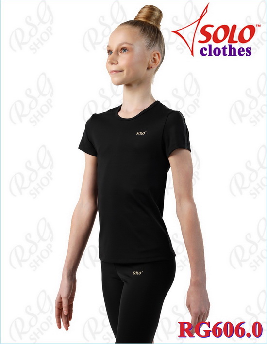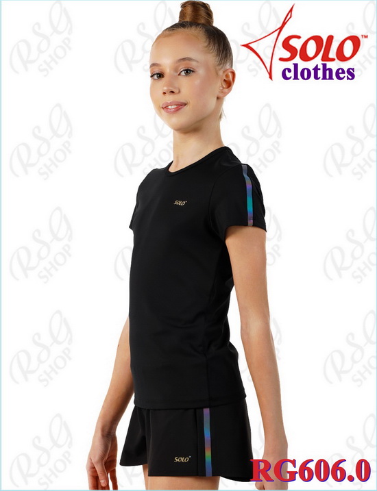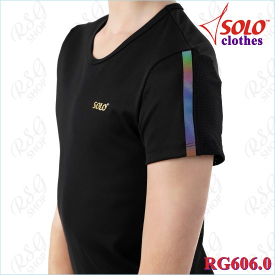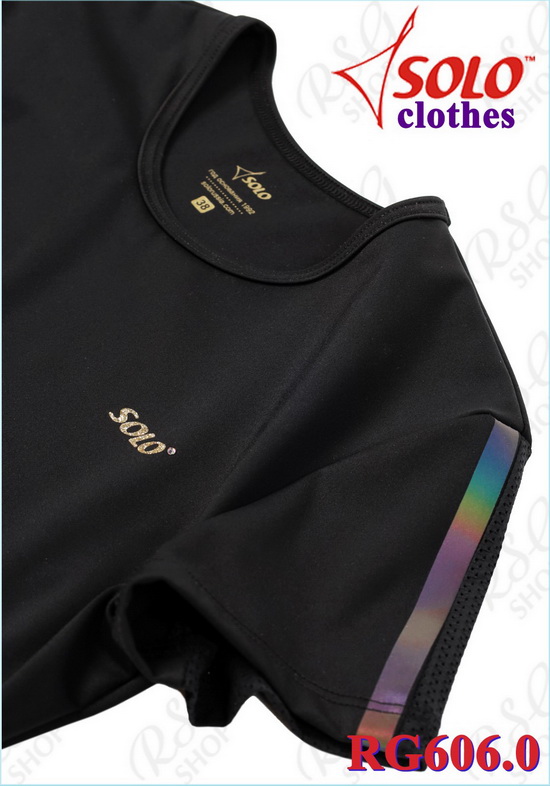 Элегантный приталенный силуэт подчёркивает фигуру. Модель RG606 - футболка с закрытыми лопатками, декоративными блестящими радужными линиями и золотистым фирменным логотипом SOLO.