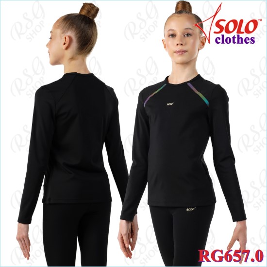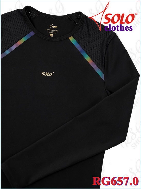 Элегантный приталенный силуэт подчёркивает фигуру. Модель RG657 - футболка с длинным рукавом, декоративными блестящими радужными линиями и золотистым фирменным логотипом SOLO.
