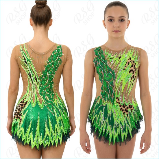 Яркий и стильный купальник для художественной и эстетической гимнастики. Дизайн разработан для RSG-SHOP по индивидуальным эскизам. Модель без рукавов с юбкой. В купальнике сочетается яркая би-эластичная ткань с бежевой сеткой. При наложении цветов применены 2D и 3D-аппликации, а также дополнительная ручная подрисовка деталей для придания рисунку объемного эффекта. Цвета яркие и насыщенные. Материал - полиамид с добавлением эластана. Ткань прекрасно тянется, не сковывает движения.